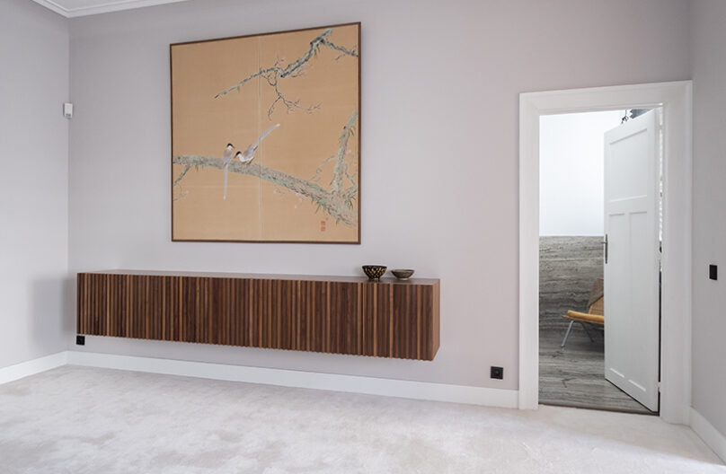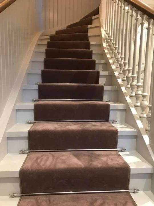 Svängda trappor sys in för hand och läggs alltid så att mattan kan flyttas i framtiden för eventuella slitageskador.